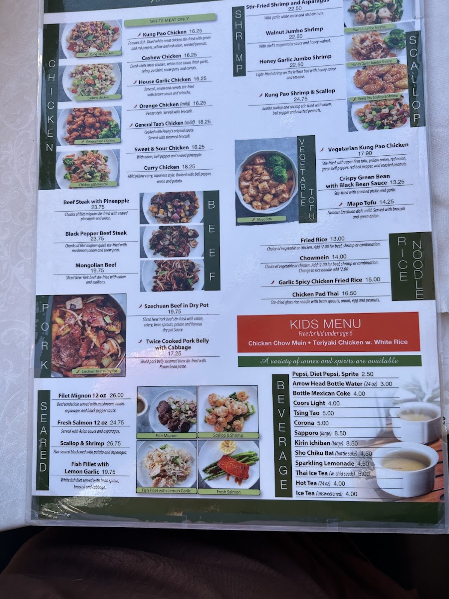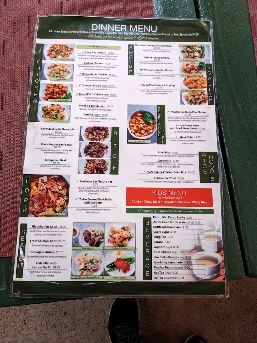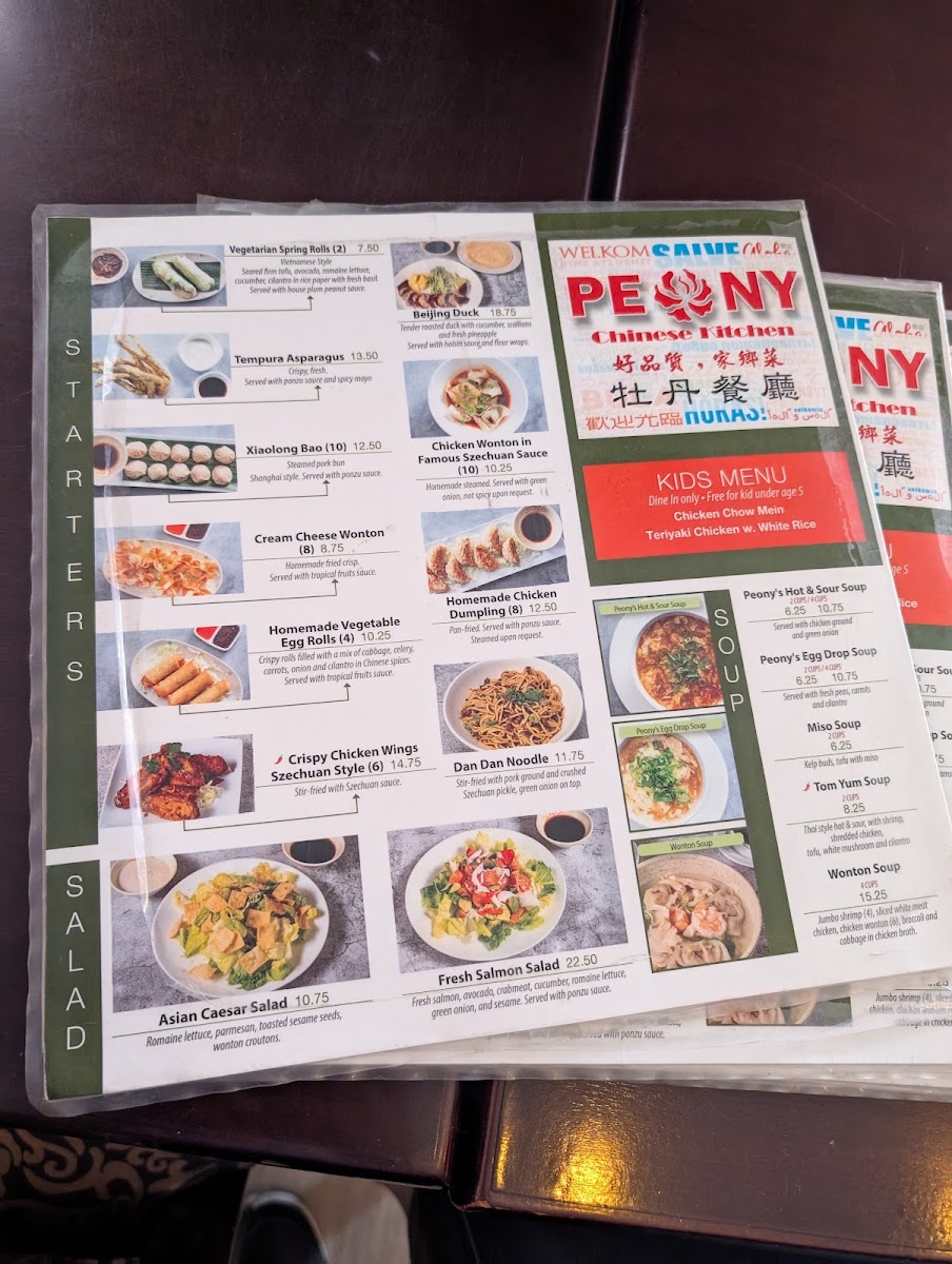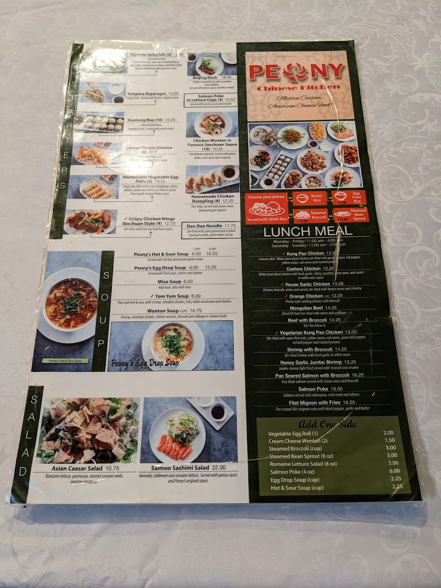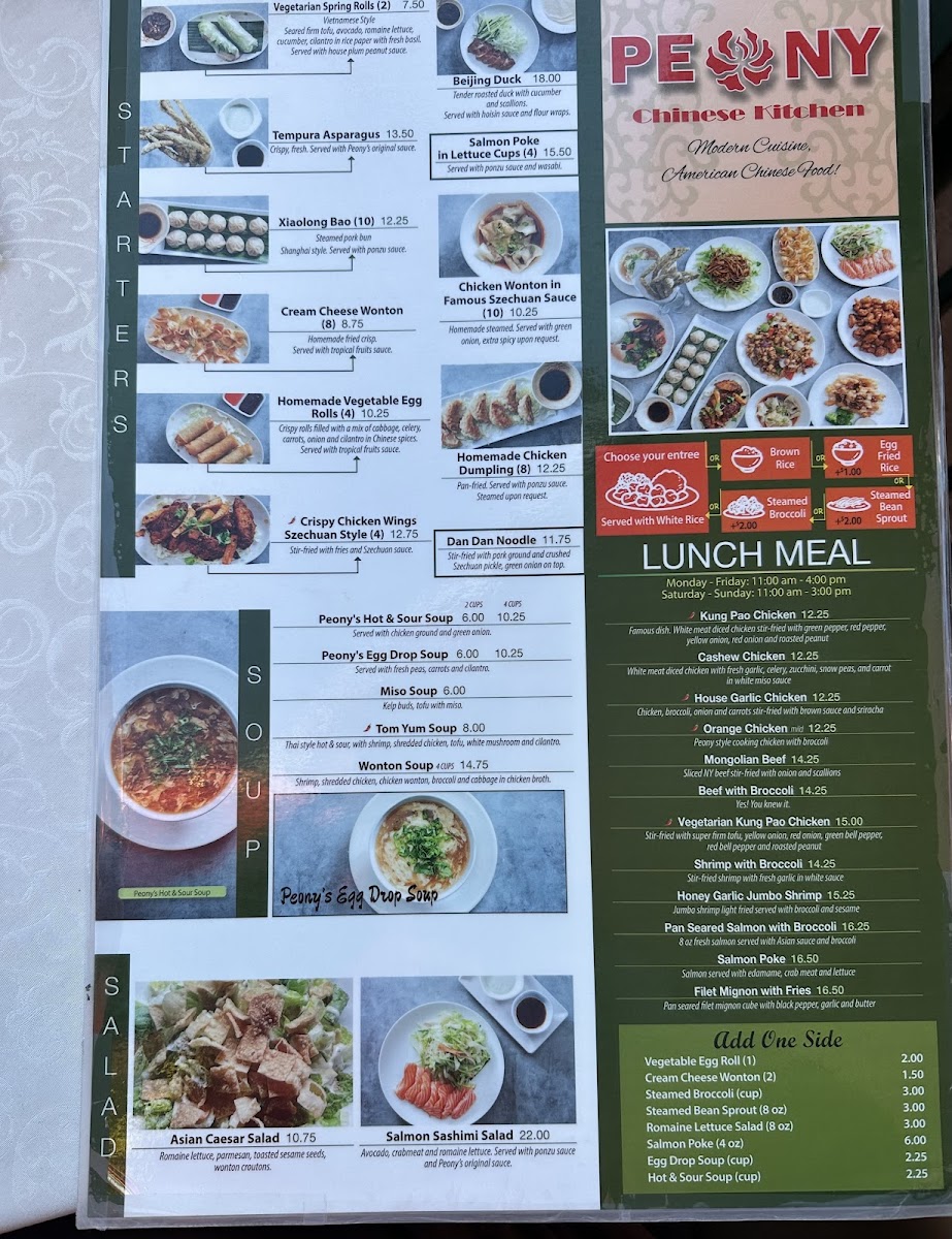 From a reviewer’s perspective, the menu at Peony Chinese Kitchen offers a well-rounded selection of classic Chinese and Asian-inspired dishes, making it easy to find something satisfying for lunch or dinner. The lunch options like Kung Pao Chicken, Cashew Chicken, House Garlic Chicken, Orange Chicken, and Mongolian Beef provide familiar, flavorful choices, while the starters such as Vegetarian Spring Rolls (2), Beijing Duck, Tempura Asparagus, Xialong Bao (Steamed Pork Bun) (10), and Chicken Wonton in Famous Szechuan Sauce (10) set a strong beginning to the meal. Soups including Peony's Hot & Sour Soup, Peony's Egg Drop Soup, Miso Soup, Tom Yum Soup, and Wonton Soup offer comforting options, and lighter fare like the Asian Caesar Salad balances the menu. Main dishes span across categories, with chicken favorites like General Tao's Chicken, hearty selections such as Beef Steak with Pineapple, Black Pepper Beef Steak, and Szechuan Beef in Dry Pot, plus seafood highlights like Stir-Fried Shrimp & Asparagus, Walnut Jumbo Shrimp, Honey Garlic Jumbo Shrimp, and Kung Pao Shrimp & Scallop. Premium seared items including Filet Mignon (12 oz), Fresh Salmon (12 oz), and Scallop & Shrimp add variety, while vegetarian choices like Vegetarian Kung Pao Chicken, Crispy Green Bean with Black Bean Sauce, and Mapo Tofu ensure there are meat-free options. To complete the meal, staples like Fried Rice, Chow Mein, and Chicken Pad Thai are available, along with sides such as White Rice, Brown Rice, and Egg Fried Rice, and drinks including Pepsi, Diet Pepsi, Sprite, Arrowhead Bottled Water (24 oz), and Bottled Mexican Coke, making the menu diverse, approachable, and satisfying overall.