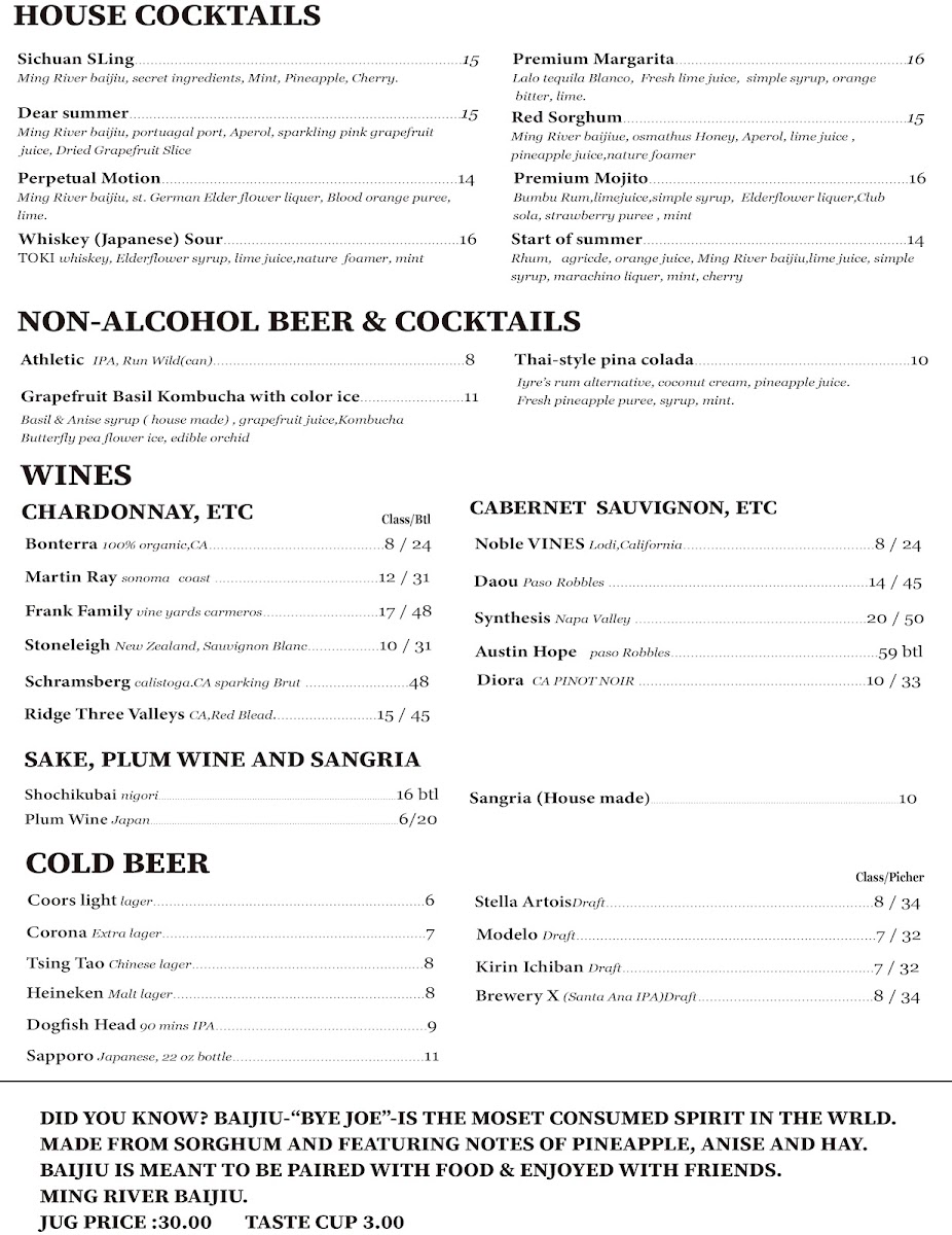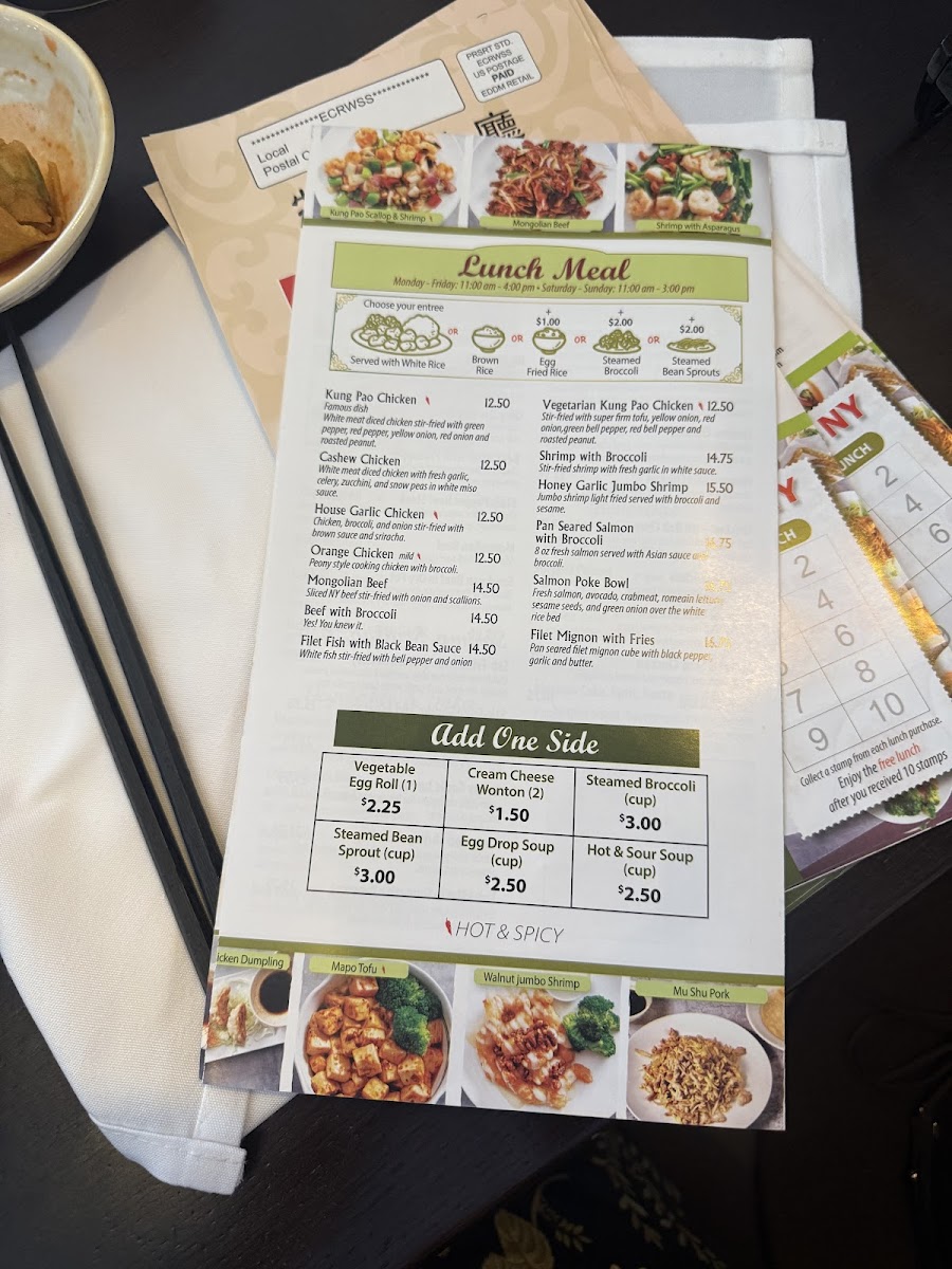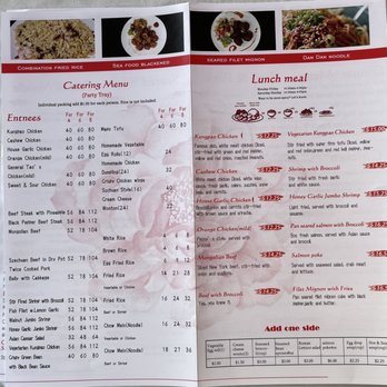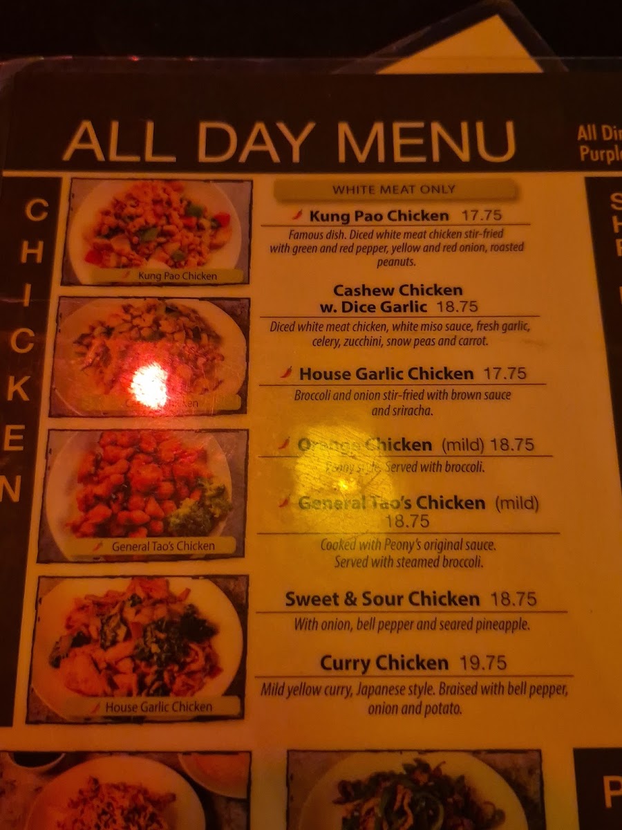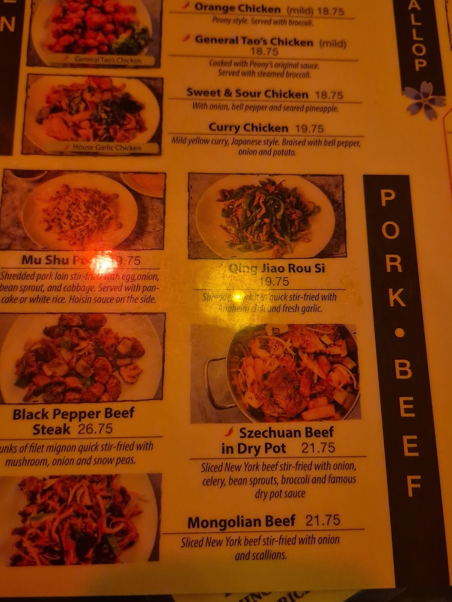 From a reviewer’s perspective, the menu at Peony Chinese Kitchen offers a well-rounded selection of classic Chinese and Asian-inspired dishes, making it easy to find something satisfying for lunch or dinner. The lunch options like Kung Pao Chicken, Cashew Chicken, House Garlic Chicken, Orange Chicken, and Mongolian Beef provide familiar, flavorful choices, while the starters such as Vegetarian Spring Rolls (2), Beijing Duck, Tempura Asparagus, Xialong Bao (Steamed Pork Bun) (10), and Chicken Wonton in Famous Szechuan Sauce (10) set a strong beginning to the meal. Soups including Peony's Hot & Sour Soup, Peony's Egg Drop Soup, Miso Soup, Tom Yum Soup, and Wonton Soup offer comforting options, and lighter fare like the Asian Caesar Salad balances the menu. Main dishes span across categories, with chicken favorites like General Tao's Chicken, hearty selections such as Beef Steak with Pineapple, Black Pepper Beef Steak, and Szechuan Beef in Dry Pot, plus seafood highlights like Stir-Fried Shrimp & Asparagus, Walnut Jumbo Shrimp, Honey Garlic Jumbo Shrimp, and Kung Pao Shrimp & Scallop. Premium seared items including Filet Mignon (12 oz), Fresh Salmon (12 oz), and Scallop & Shrimp add variety, while vegetarian choices like Vegetarian Kung Pao Chicken, Crispy Green Bean with Black Bean Sauce, and Mapo Tofu ensure there are meat-free options. To complete the meal, staples like Fried Rice, Chow Mein, and Chicken Pad Thai are available, along with sides such as White Rice, Brown Rice, and Egg Fried Rice, and drinks including Pepsi, Diet Pepsi, Sprite, Arrowhead Bottled Water (24 oz), and Bottled Mexican Coke, making the menu diverse, approachable, and satisfying overall.